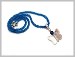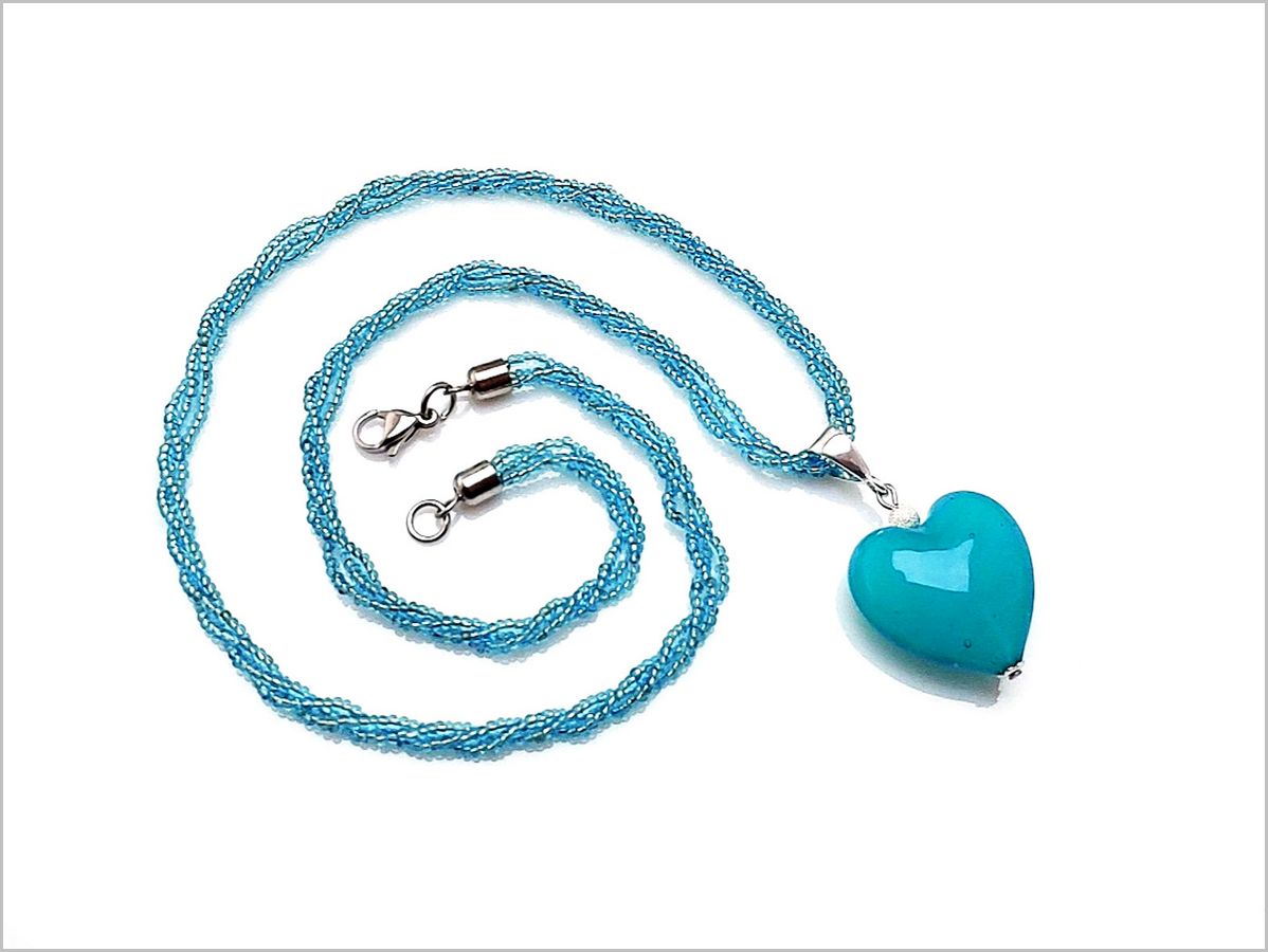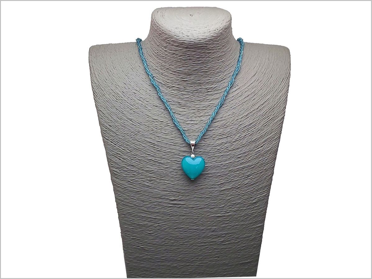 Le pendentif est suspendu à une bélière en Argent 925, sur un collier 3 rangs en micro perles Murano Conterie turquoise. Le collier peut se porter ample ou torsadé.