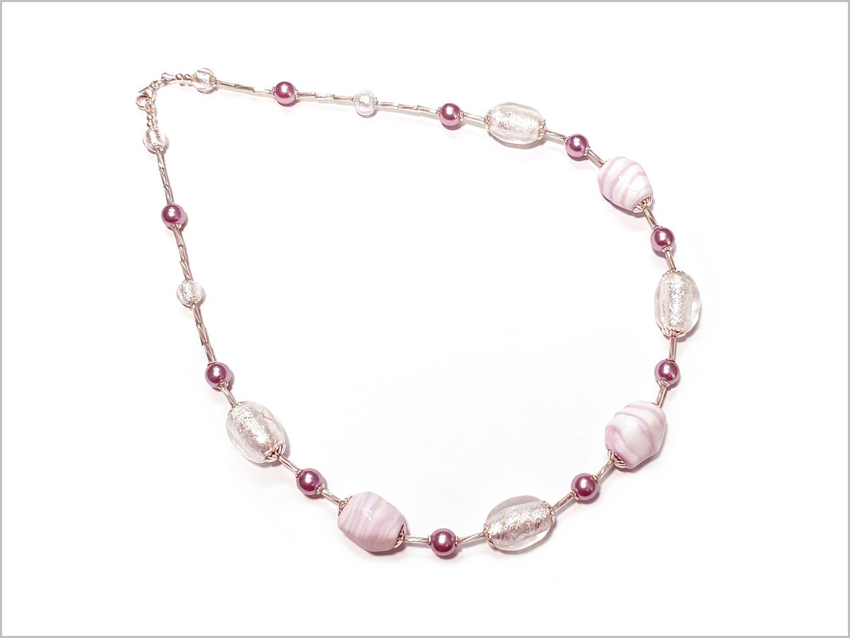 Perles Striati blanc Opalino avec volutes de verre rose poudré, perles ovales et rondes Cristallo feuille d'argent.