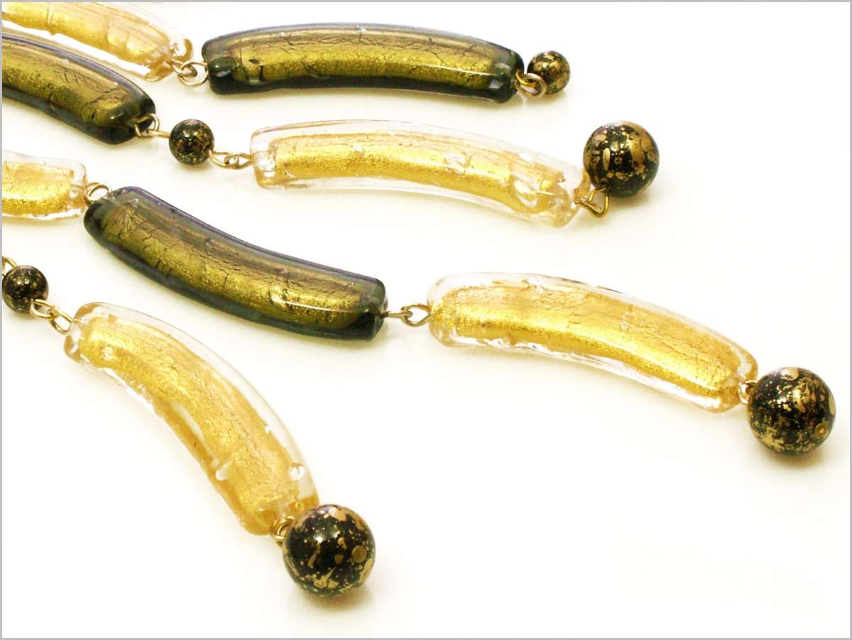 Telle une extraordinaire parure antique Inca, ce somptueux collier en Verre de Murano vert mousse et or déploie ses longues perles incurvées, entièrement incrustées de feuille d'or.