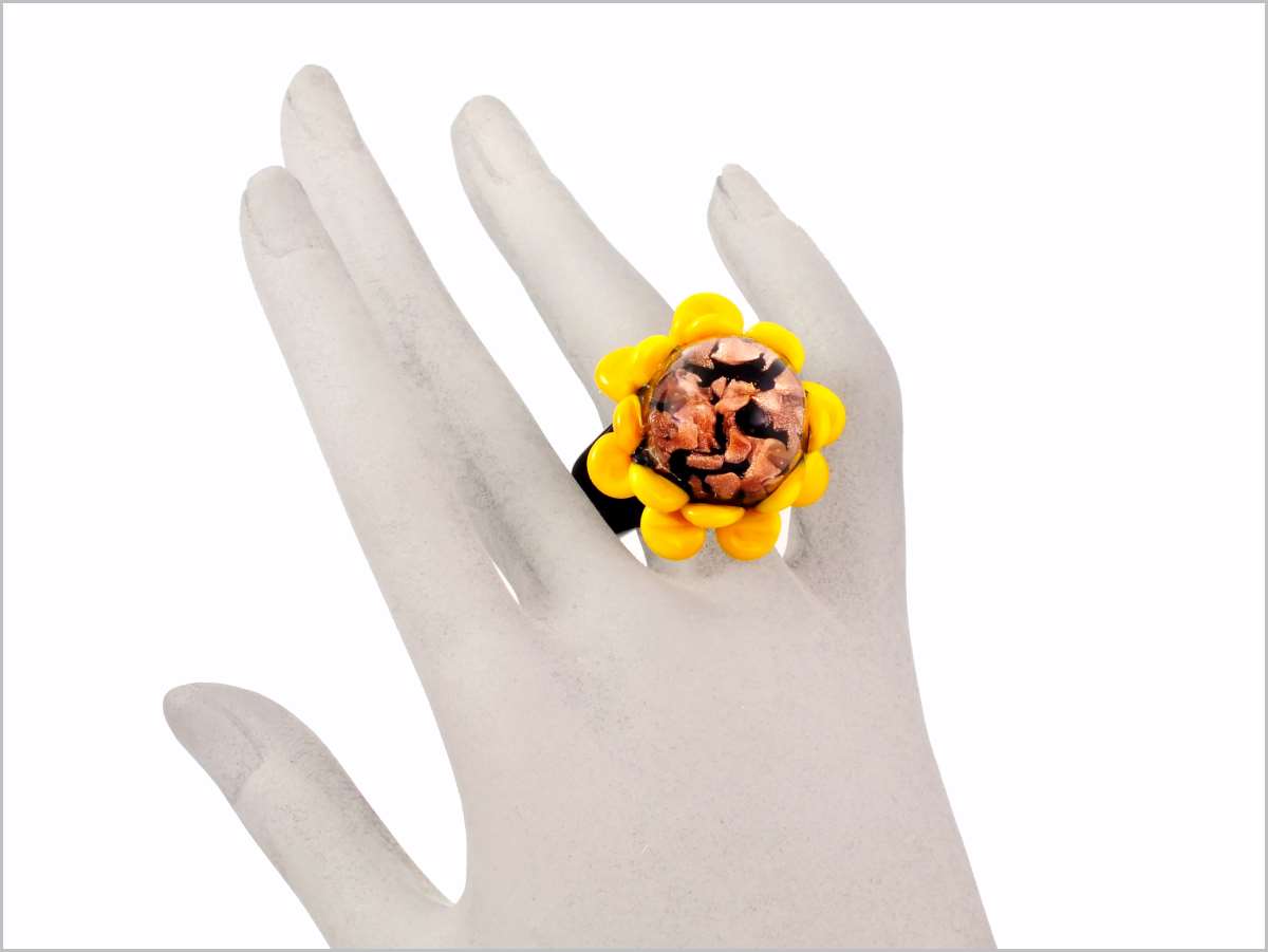 fleur de tournesol qui s'épanouit sous le soleil d'été orne cette bague en Verre de Murano jaune et noir de jais.