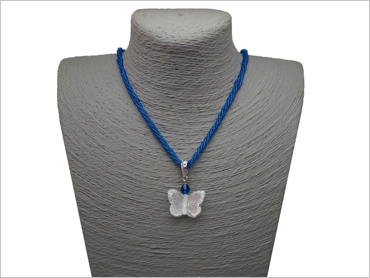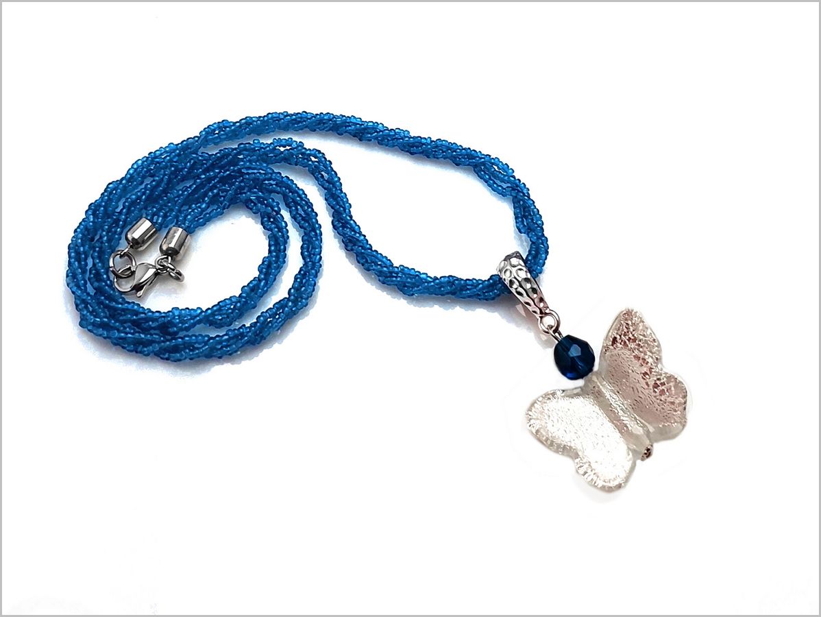 La papillon est suspendu à une bélière ouvragée en plaqué argent, sur un collier 3 rangs de micro perles Murano Conterie bleu outremer.
