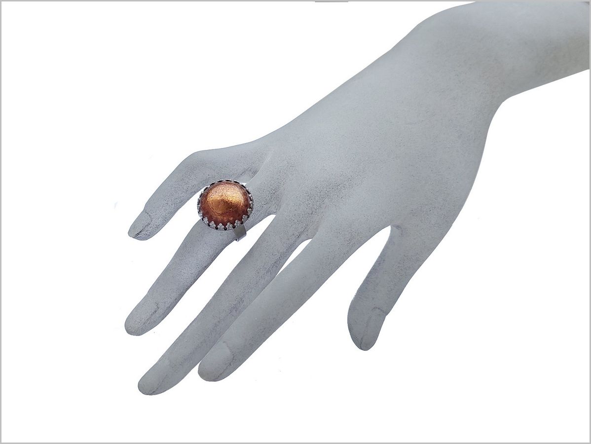 L'artisan crée la base du cabochon avec du verre translucent de couleur améthyste et lui donne sa jolie forme bombée. Il incruste ensuite délicatement plusieurs couches de feuille d'or et une dernière couche de verre améthyste vient enlacer la feuille d'or comme dans un écrin, ce qui donne une magnifique couleur bronze aux reflets mordorés.