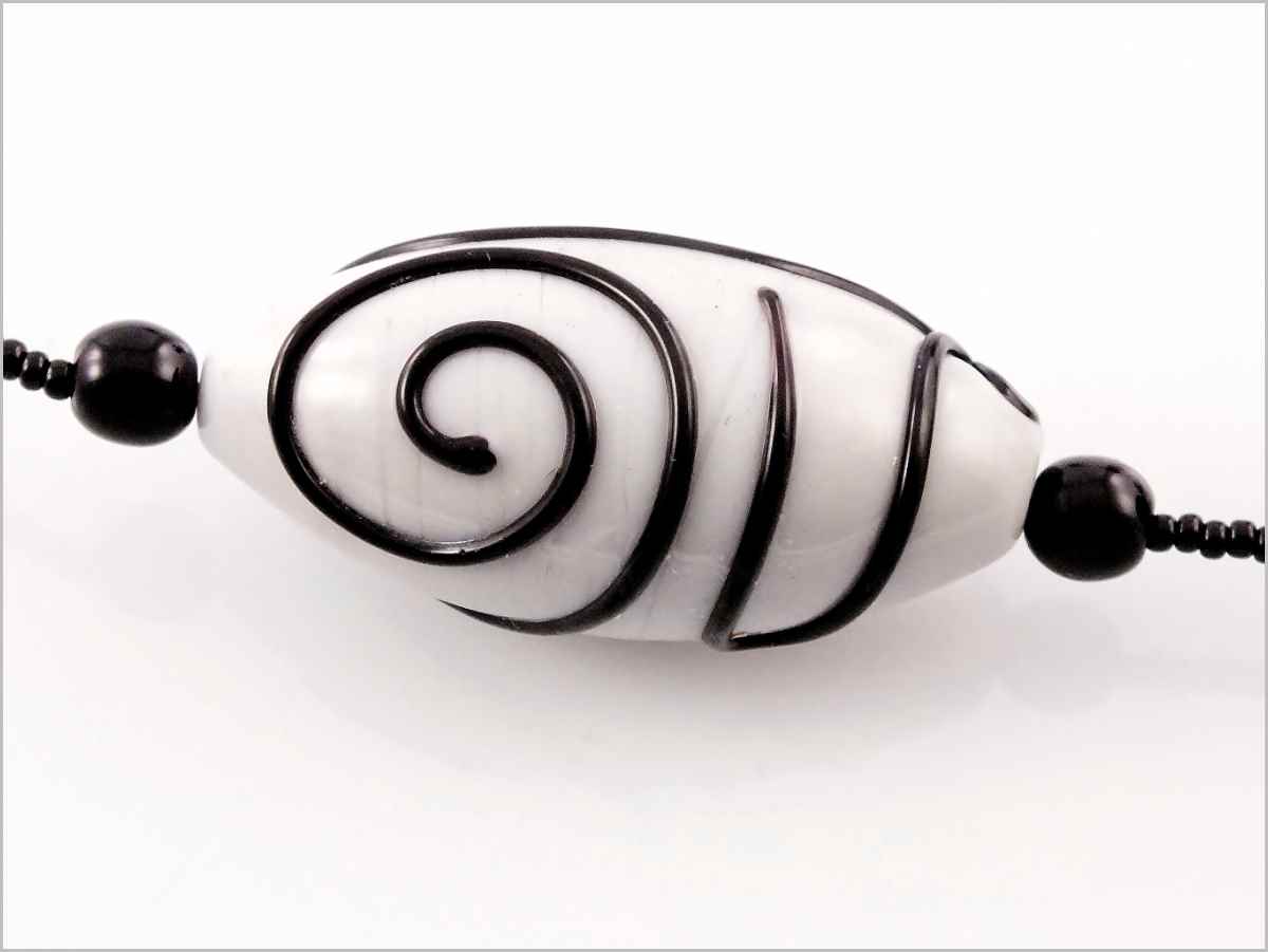 La base de la perle est réalisée en verre mat gris clair. L'artisan chauffe ensuite le verre noir de jais, duquel il tire une très fine baguette, qu'il va utiliser comme un pinceau, pour créer et enrouler des volutes aériennes autour des perles.