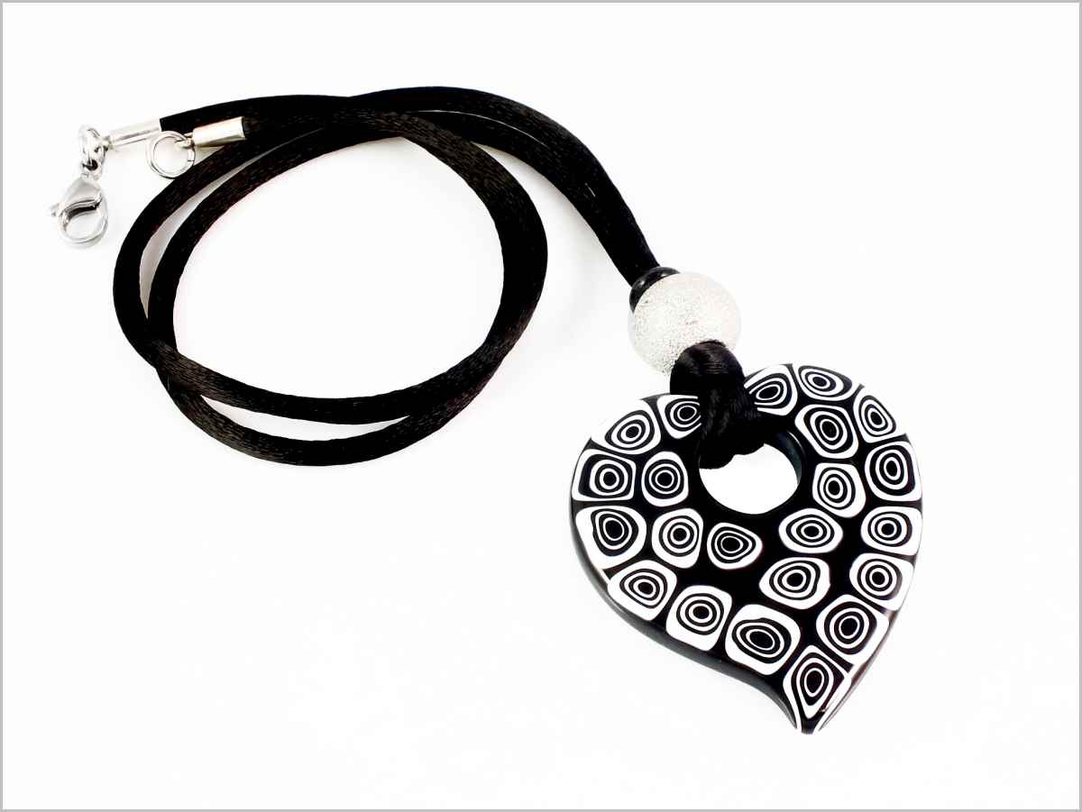 Les petits motifs de Murrine blancs et noirs sont incrustés à l'intérieur d'un cerclage métallique en forme de coeur. La forme ainsi obtenue est alors cuite au four, pour fondre et fusionner tous les petits motifs de canne de verre.